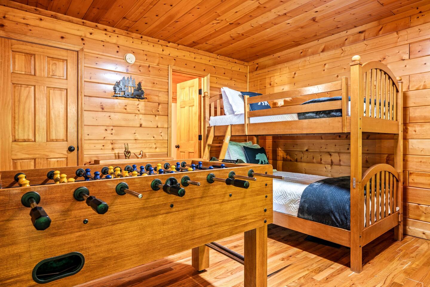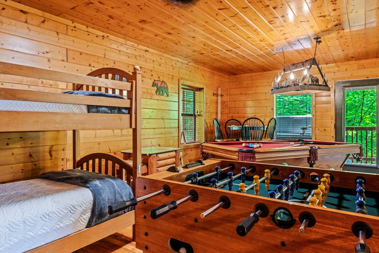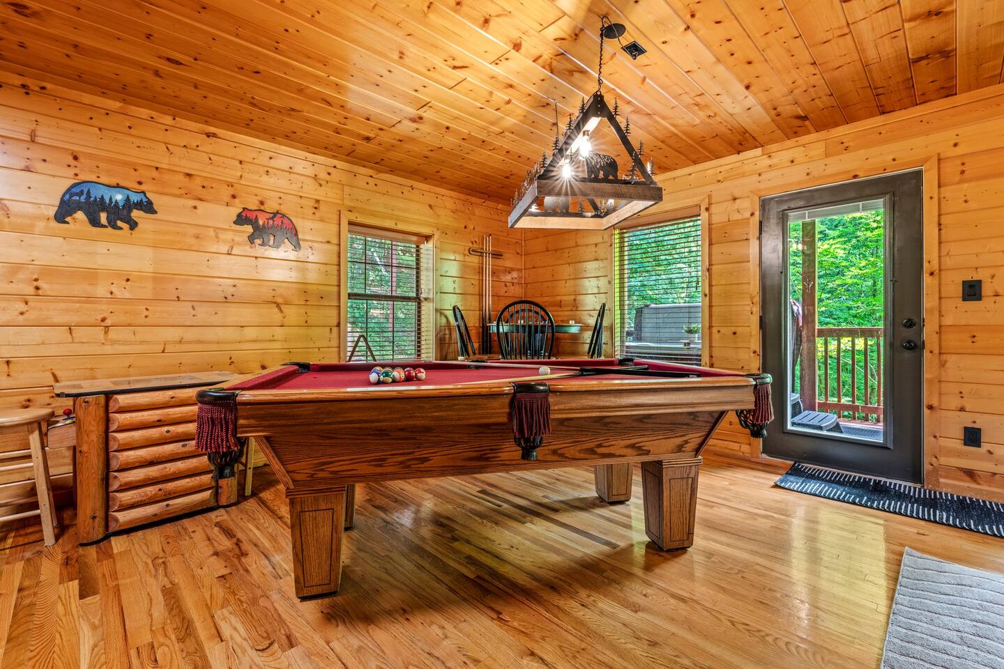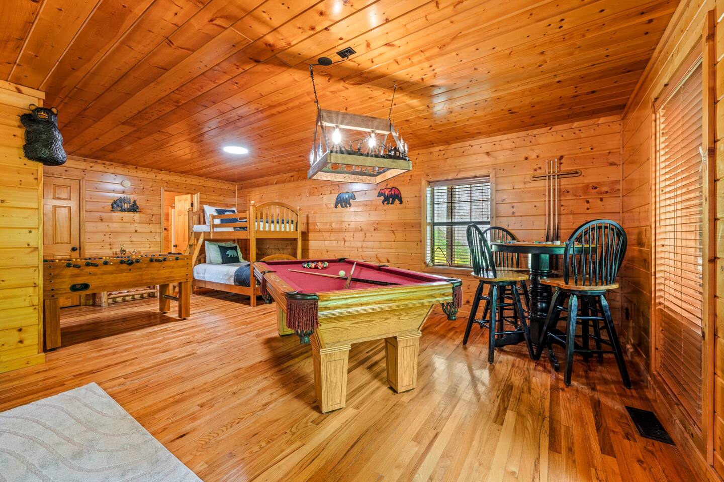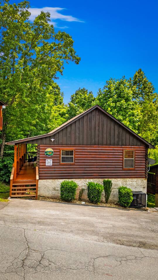 Black Bear Retreat welcomes you to your mountain escape! Enjoy easy access to Dollywood and Splash Country & all that Pigeon Forge and the surrounding area has to offer! Your cabin is located in Hidden Springs Resort, a quiet resort setting with all of these attractions so close that you can hear the Dollywood train whistle from the decks! OVERVIEW In your 2 bedroom 2 bath cabin, the upper level boasts a well equipped kitchen where you can enjoy a meal with family and friends at the dining table or outside on the upper level deck overlooking the serene woods. On the lower level, you'll enjoy a private hot tub, outdoor lounge area, game room with pool table, foosball, arcade table for 1-2 players and bunk beds. MODERN AMENITIES ★Coffee & Tea Bar: Start your morning right at your coffee and tea bar! Keurig, French Press, hot water kettle, K cups, a variety of teas, flavor syrups, creamer, and sweetener are available for your use. ★Roku Smart TVs located in each bedroom and in both living areas, allowing you to stream from all platforms. Guest mode is enabled on the TVs, so enjoy streaming with the peace of mind that you'll be automatically logged out of your accounts upon checkout. ★Outlets with USB & USB-C plugs: Don't stress about finding a plug in! Each bedside table is equipped with lamps that have a standard plug, USB, and USB-C plug. Additionally, you'll be happy to find USB and USB-C plugs at several conveniently located outlets throughout the cabin! ★High speed WiFi available CABIN LAYOUT MAIN FLOOR ★Open floorplan kitchen, dining, living areas with coffee and tea bar and queen size sleeper sofa. ★Coffee & tea bar where you can make your perfect cup! ★65" Roku Smart TV in the inviting living area. ★Gorgeous floor to ceiling windows and stacked stone gas fireplace (available November through March). ★King bedroom with Roku Smart TV adjacent to main level full bathroom with walk in shower. ★Large dining table for enjoying meals indoor. ★Access to a spacious deck overlooking a serene wooded area: - Outdoor dining space for up to 8 - Rocking chairs - Bear themed glider LOWER LEVEL ★Second living space with 55" Roku Smart TV and a large coffee table perfect for family game night! ★Lower deck with private hot tub and outdoor seating area. ★Game room with: - Pool table - Arcade table for 1-2 players - Foosball table - A select variety of board games - Bar height table for hanging out ★King bedroom and Roku Smart TV adjacent to second bathroom. ★Bathroom with shower/tub combo. ★Twin size bunk beds and queen pullout sofa. ★Washer and dryer with iron. LOCATION - <1.5 miles to Dollywood - 4 miles to The Ripken Experience - 4 miles to Pigeon Forge - 6.5 miles to Tanger Outlets Sevierville - 10 miles to Gatlinburg - 14 miles to Great Smoky Mountains NP Gatlinburg Entrance - 14 miles to Great Smoky Mountains NP Greenbrier Entrance - 15 miles to Douglas Lake