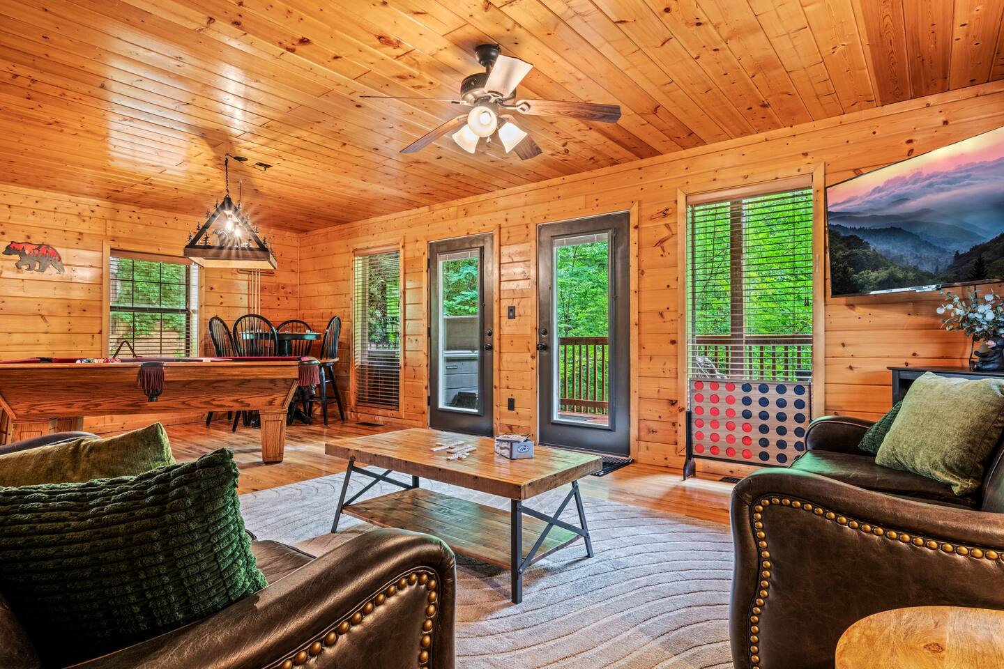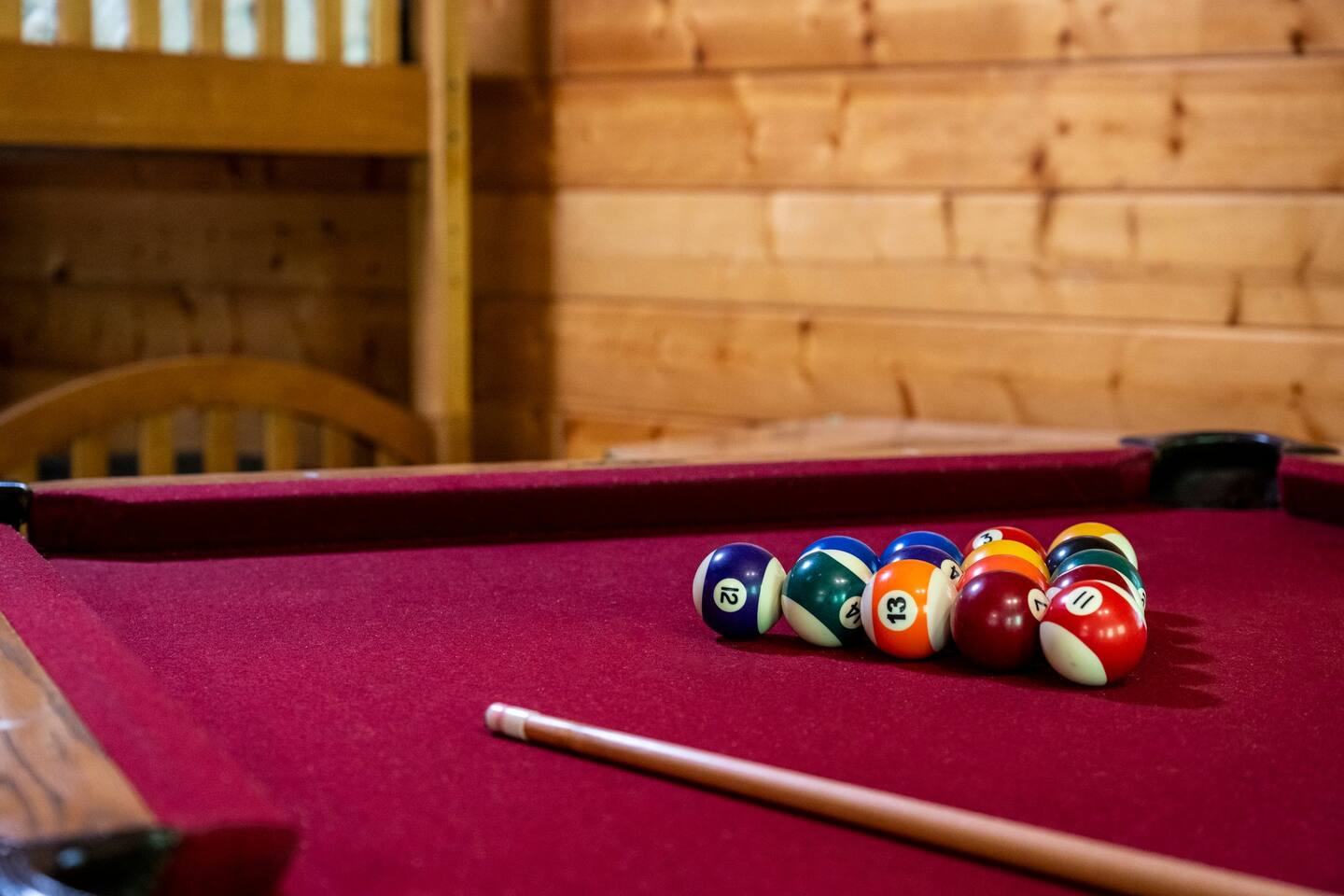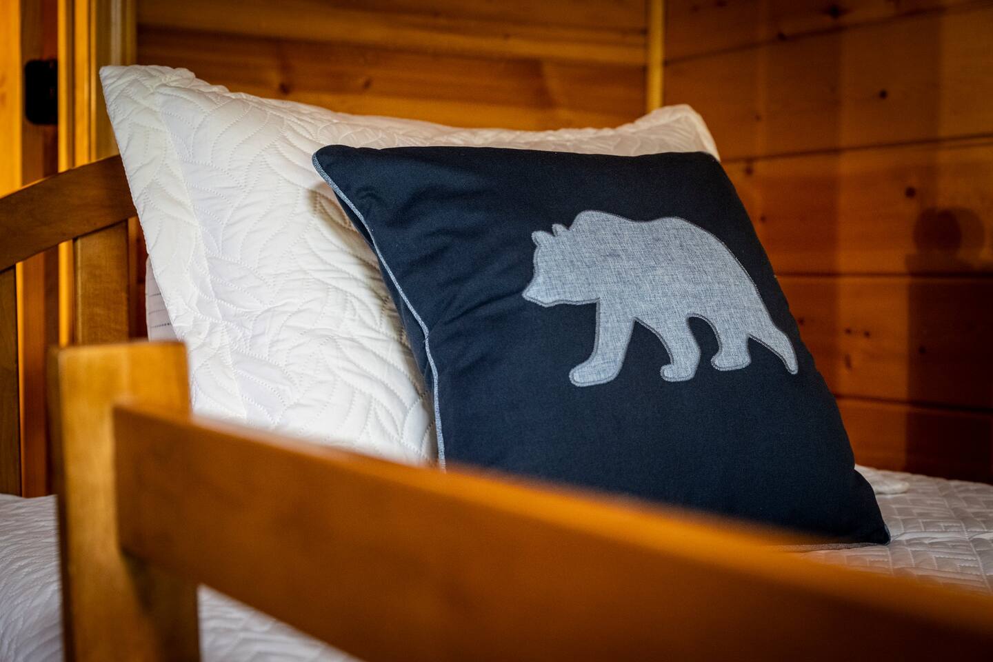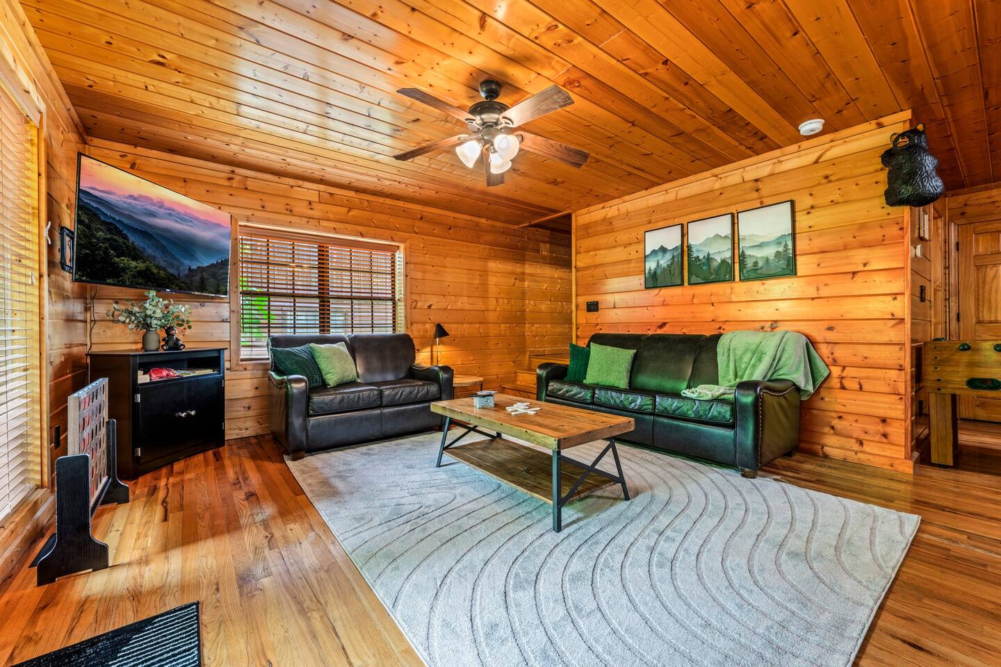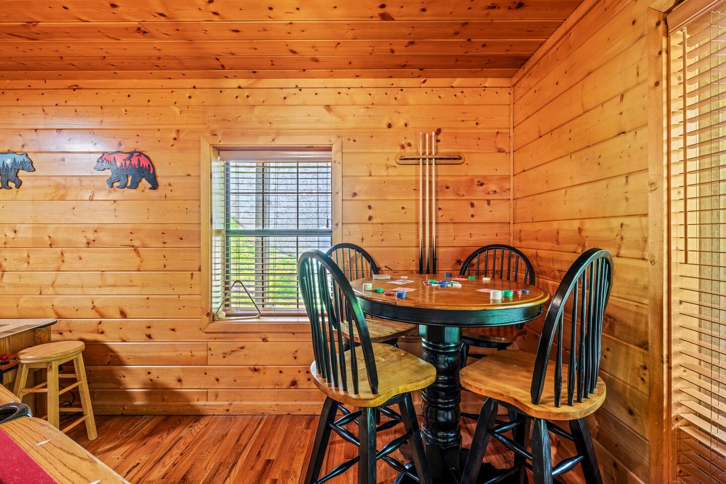 Black Bear Retreat welcomes you to your mountain escape! Enjoy easy access to Dollywood and Splash Country & all that Pigeon Forge and the surrounding area has to offer! Your cabin is located in Hidden Springs Resort, a quiet resort setting with all of these attractions so close that you can hear the Dollywood train whistle from the decks! OVERVIEW In your 2 bedroom 2 bath cabin, the upper level boasts a well equipped kitchen where you can enjoy a meal with family and friends at the dining table or outside on the upper level deck overlooking the serene woods. On the lower level, you'll enjoy a private hot tub, outdoor lounge area, game room with pool table, foosball, arcade table for 1-2 players and bunk beds. MODERN AMENITIES ★Coffee & Tea Bar: Start your morning right at your coffee and tea bar! Keurig, French Press, hot water kettle, K cups, a variety of teas, flavor syrups, creamer, and sweetener are available for your use. ★Roku Smart TVs located in each bedroom and in both living areas, allowing you to stream from all platforms. Guest mode is enabled on the TVs, so enjoy streaming with the peace of mind that you'll be automatically logged out of your accounts upon checkout. ★Outlets with USB & USB-C plugs: Don't stress about finding a plug in! Each bedside table is equipped with lamps that have a standard plug, USB, and USB-C plug. Additionally, you'll be happy to find USB and USB-C plugs at several conveniently located outlets throughout the cabin! ★High speed WiFi available CABIN LAYOUT MAIN FLOOR ★Open floorplan kitchen, dining, living areas with coffee and tea bar and queen size sleeper sofa. ★Coffee & tea bar where you can make your perfect cup! ★65" Roku Smart TV in the inviting living area. ★Gorgeous floor to ceiling windows and stacked stone gas fireplace (available November through March). ★King bedroom with Roku Smart TV adjacent to main level full bathroom with walk in shower. ★Large dining table for enjoying meals indoor. ★Access to a spacious deck overlooking a serene wooded area: - Outdoor dining space for up to 8 - Rocking chairs - Bear themed glider LOWER LEVEL ★Second living space with 55" Roku Smart TV and a large coffee table perfect for family game night! ★Lower deck with private hot tub and outdoor seating area. ★Game room with: - Pool table - Arcade table for 1-2 players - Foosball table - A select variety of board games - Bar height table for hanging out ★King bedroom and Roku Smart TV adjacent to second bathroom. ★Bathroom with shower/tub combo. ★Twin size bunk beds and queen pullout sofa. ★Washer and dryer with iron. LOCATION - <1.5 miles to Dollywood - 4 miles to The Ripken Experience - 4 miles to Pigeon Forge - 6.5 miles to Tanger Outlets Sevierville - 10 miles to Gatlinburg - 14 miles to Great Smoky Mountains NP Gatlinburg Entrance - 14 miles to Great Smoky Mountains NP Greenbrier Entrance - 15 miles to Douglas Lake