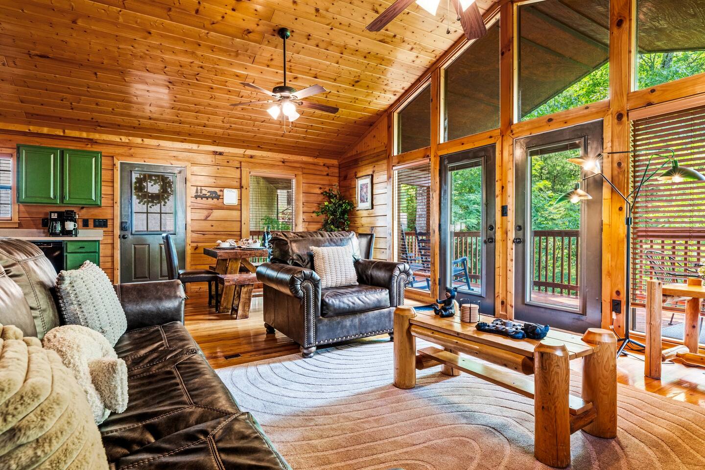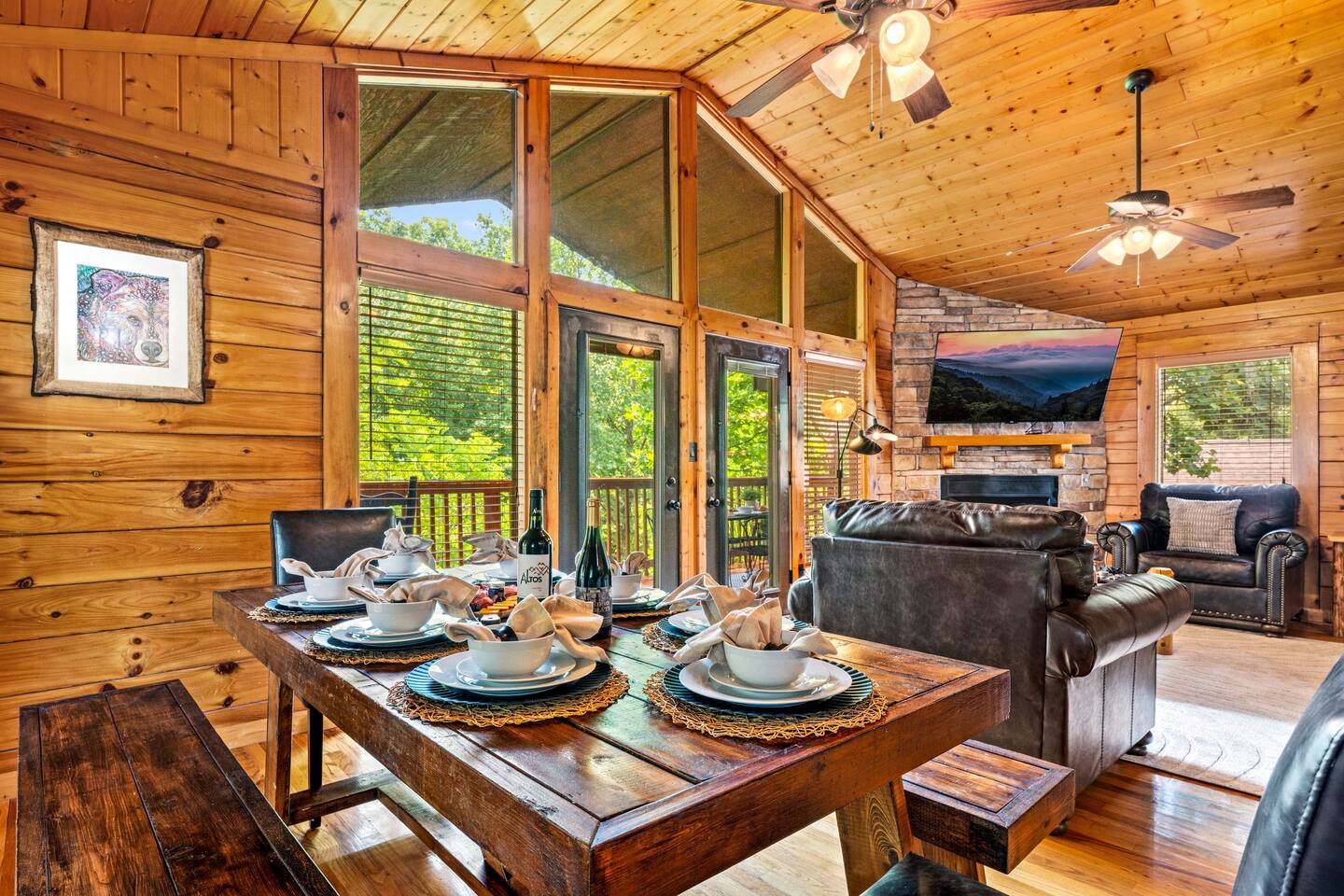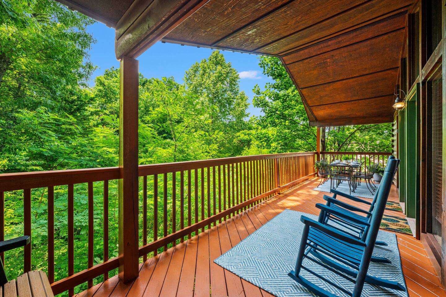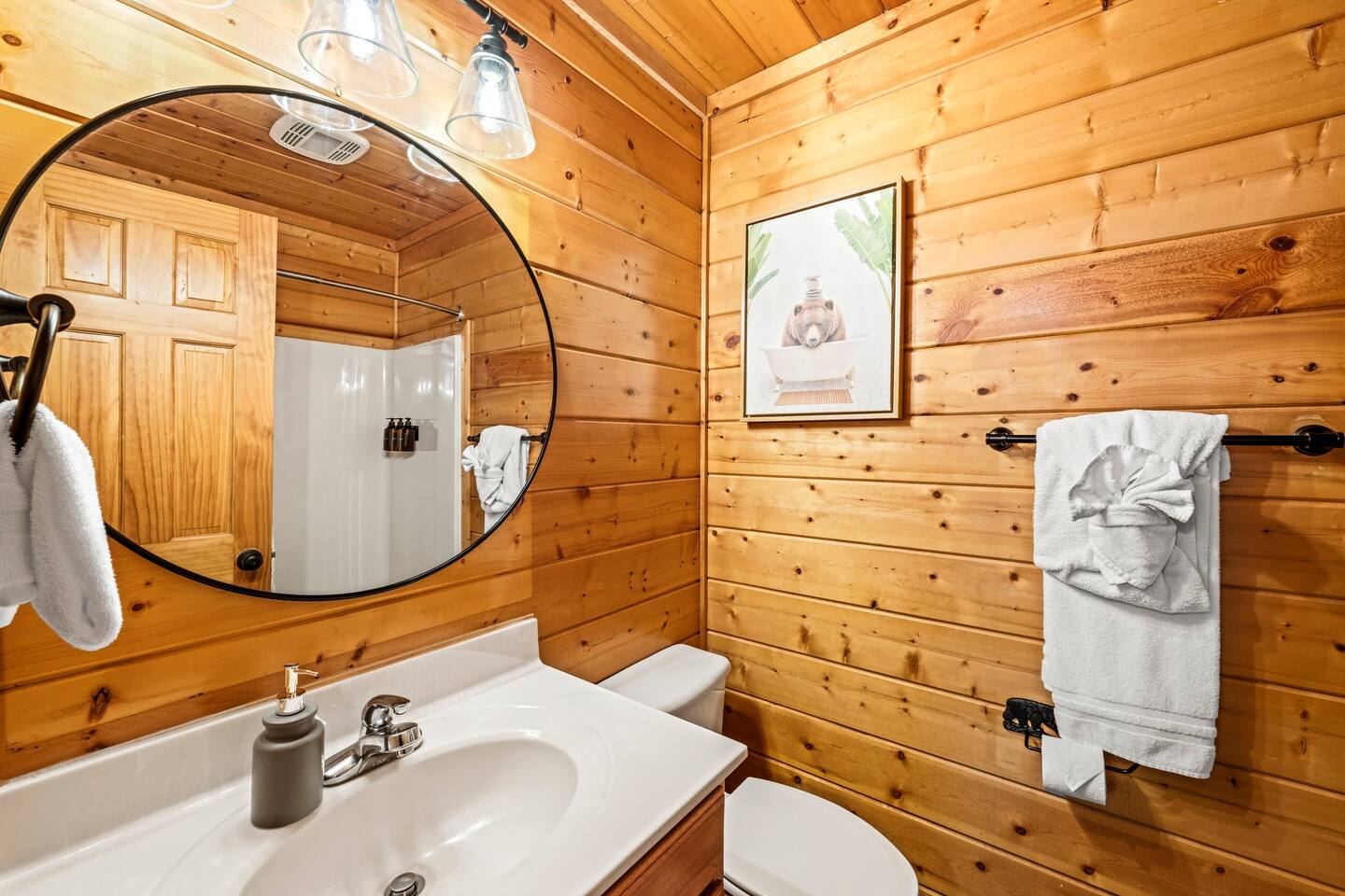 Black Bear Retreat welcomes you to your mountain escape! Enjoy easy access to Dollywood and Splash Country & all that Pigeon Forge and the surrounding area has to offer! Your cabin is located in Hidden Springs Resort, a quiet resort setting with all of these attractions so close that you can hear the Dollywood train whistle from the decks! OVERVIEW In your 2 bedroom 2 bath cabin, the upper level boasts a well equipped kitchen where you can enjoy a meal with family and friends at the dining table or outside on the upper level deck overlooking the serene woods. On the lower level, you'll enjoy a private hot tub, outdoor lounge area, game room with pool table, foosball, arcade table for 1-2 players and bunk beds. MODERN AMENITIES ★Coffee & Tea Bar: Start your morning right at your coffee and tea bar! Keurig, French Press, hot water kettle, K cups, a variety of teas, flavor syrups, creamer, and sweetener are available for your use. ★Roku Smart TVs located in each bedroom and in both living areas, allowing you to stream from all platforms. Guest mode is enabled on the TVs, so enjoy streaming with the peace of mind that you'll be automatically logged out of your accounts upon checkout. ★Outlets with USB & USB-C plugs: Don't stress about finding a plug in! Each bedside table is equipped with lamps that have a standard plug, USB, and USB-C plug. Additionally, you'll be happy to find USB and USB-C plugs at several conveniently located outlets throughout the cabin! ★High speed WiFi available CABIN LAYOUT MAIN FLOOR ★Open floorplan kitchen, dining, living areas with coffee and tea bar and queen size sleeper sofa. ★Coffee & tea bar where you can make your perfect cup! ★65" Roku Smart TV in the inviting living area. ★Gorgeous floor to ceiling windows and stacked stone gas fireplace (available November through March). ★King bedroom with Roku Smart TV adjacent to main level full bathroom with walk in shower. ★Large dining table for enjoying meals indoor. ★Access to a spacious deck overlooking a serene wooded area: - Outdoor dining space for up to 8 - Rocking chairs - Bear themed glider LOWER LEVEL ★Second living space with 55" Roku Smart TV and a large coffee table perfect for family game night! ★Lower deck with private hot tub and outdoor seating area. ★Game room with: - Pool table - Arcade table for 1-2 players - Foosball table - A select variety of board games - Bar height table for hanging out ★King bedroom and Roku Smart TV adjacent to second bathroom. ★Bathroom with shower/tub combo. ★Twin size bunk beds and queen pullout sofa. ★Washer and dryer with iron. LOCATION - <1.5 miles to Dollywood - 4 miles to The Ripken Experience - 4 miles to Pigeon Forge - 6.5 miles to Tanger Outlets Sevierville - 10 miles to Gatlinburg - 14 miles to Great Smoky Mountains NP Gatlinburg Entrance - 14 miles to Great Smoky Mountains NP Greenbrier Entrance - 15 miles to Douglas Lake